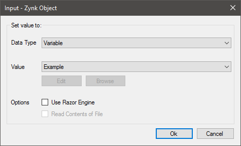 Razor can be used to access any type of variable in Zynk (except for system variables), and it's value can be used for a task setting or in a template. To use a variable for a task setting, you must enable the 'Use Razor Engine' option in the Zynk Object Editor. To access a variable with razor, reference the system Context and then choose the correct collection within that context, depending on the type of the variable.